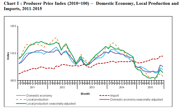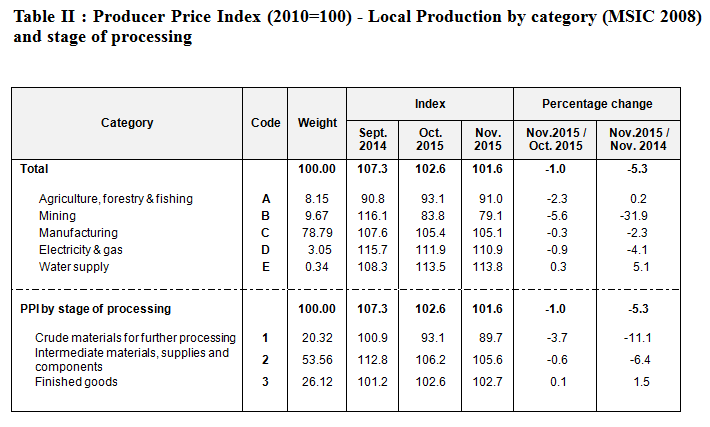 Year-on-year comparison showed that the PPI for domestic economy in November 2015 decreased by 3.0 per cent with local production index dropped by 5.3 per cent while the import price index increased by 1.8 per cent.(Table I)