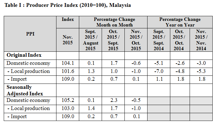 The PPI for domestic economy in November 2015 registered a decrease of 0.6 per cent when compared with the previous month. This was due to the decrease in local production index (-1.0%) and an increase in import price index (+0.1%).
