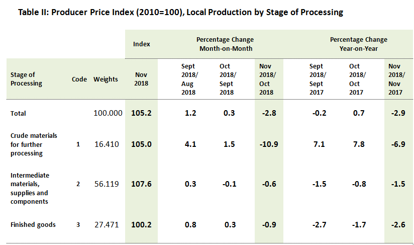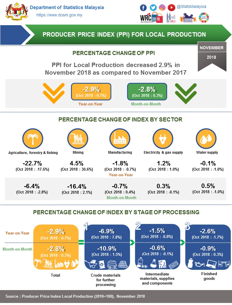 On a yearly basis, the PPI for local production by SOP for November 2018 dropped 2.9 per cent. Index of Crude materials for further processing, Finished goods and Intermediate materials, supplies & components recorded a decrease of 6.9 per cent, 2.6 per cent and 1.5 per cent respectively.
