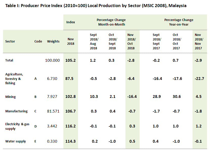 As compared to the previous month, the PPI for local production registered a decline of 2.8 per cent in November 2018 which was contributed by the index of Mining (-16.4%), Agriculture, forestry & fishing (-6.4%) and Manufacturing (-0.7%). Meanwhile, Water supply and Electricity & gas supply increased 0.5 per cent and 0.3 per cent respectively.