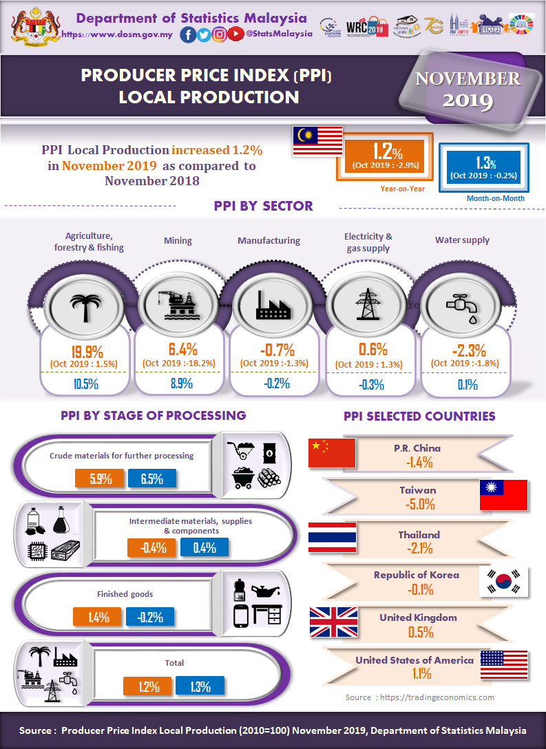 In November 2019, the PPI local production by stage of processing (SOP) grew 1.2 per cent as compared to November 2018. It was contributed by Crude materials for further processing (5.9%) and Finished goods (1.4%) indices. However, the index of Intermediate materials, supplies & components declined 0.4 per cent.