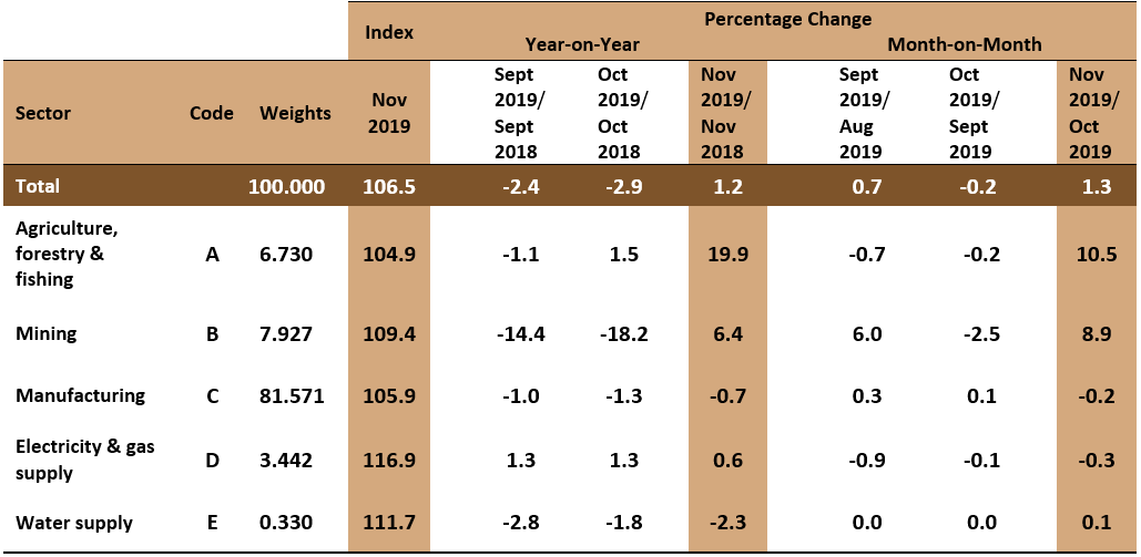 The Producer Price Index (PPI) local production increased 1.2 per cent in November 2019 to 106.5 as against 105.2 in the same month of the preceding year. This was the first positive yearly basis change after declining for twelve consecutive months since November 2018. The index of Agriculture, forestry & fishing recorded a double digit increase of 19.9 per cent, followed by Mining (6.4%) and Electricity & gas supply (0.6%) indices. In contrast, the Water supply and Manufacturing indices declined 2.3 per cent and 0.7 per cent respectively.