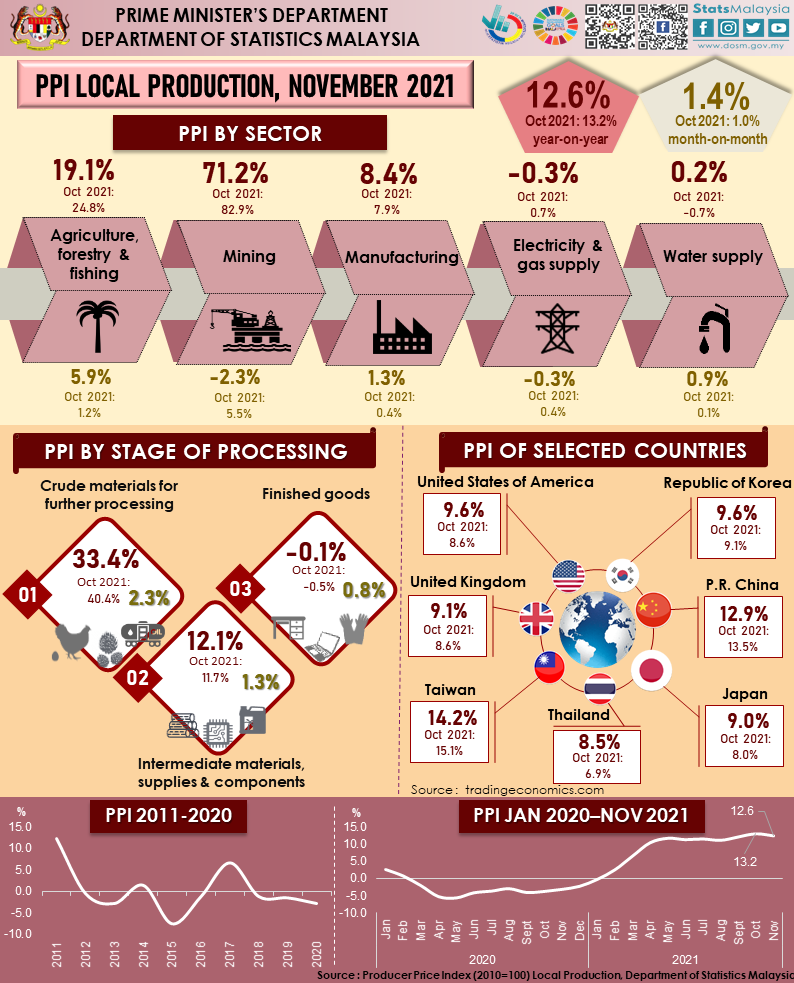The Producer Price Index (PPI) local production in November 2021 increased 12.6 per cent as opposed to 3.0 per cent decline recorded in the same month of the preceding year, mainly driven by surging costs of raw materials. This marks the eighth consecutive months that the inflation from the producer’s perspective registering a double-digit increase this year. The increase in the PPI local production during this month was attributed by Mining index that surged 71.2 per cent as compared to 45.8 per cent drop recorded in November 2020. The rise in prices of Crude oil (79.8%) and Natural gas (38.2%) have contributed to this increase. The Agriculture, forestry & fishing index also increase but at a slower rate of 19.1 per cent (November 2020: 21.5%), largely due to the increase in the indices of Oil palm fresh fruit bunches (25.2%), Chicken (18.1%) and Hen’s eggs (8.3%). In addition, Manufacturing index rose 8.4 per cent in November 2021 contributed by the indices for subsectors of Manufacture of refined petroleum products (26.2%) and Manufacture of vegetable & animal oils & fats (21.9%). Water supply index increased marginally by 0.2 per cent. However, the index of Electricity & gas supply declined 0.3 per cent.