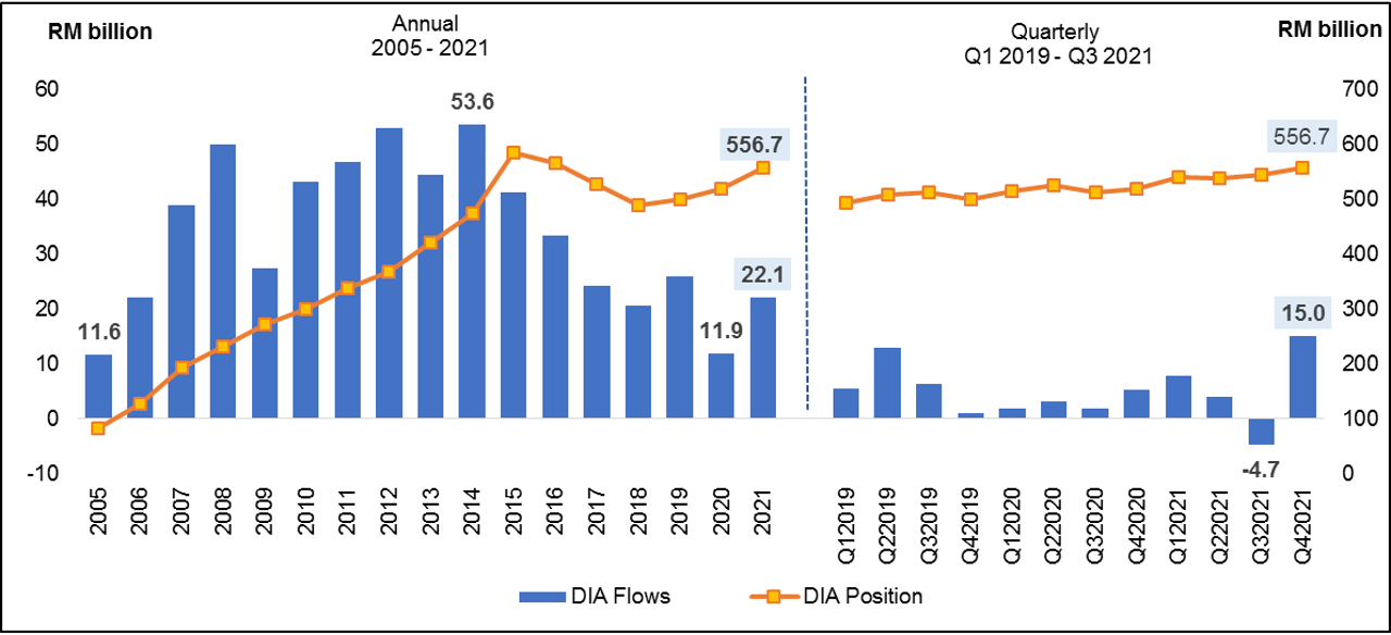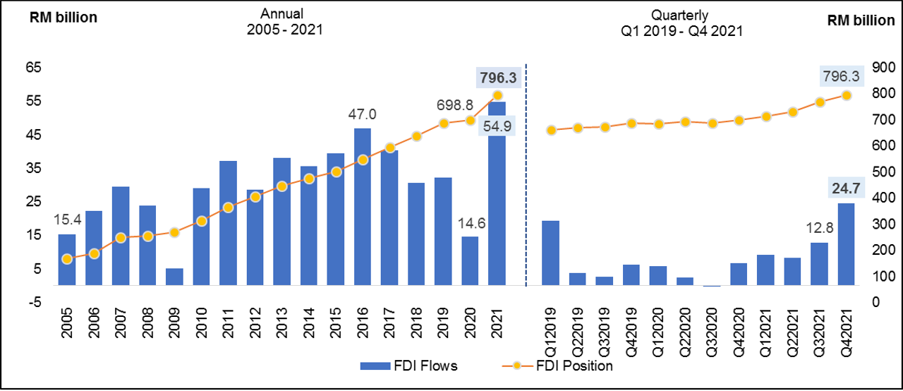 Chart 3: Foreign Direct Investment (FDI) in Malaysia Flows and Position, 2005 – 2021 and Q1 2019 – Q4 2021