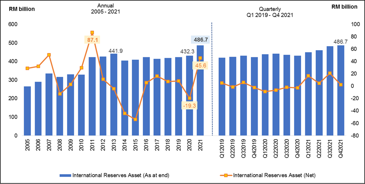 As at the end of 2021, both FDI and DIA position expanded to RM796.3 billion and RM556.7 billion, respectively. Malaysia’s International Investment Position (IIP) registered a net asset of RM91.0 billion, while Malaysia’s international reserves stood at RM486.7 billion.