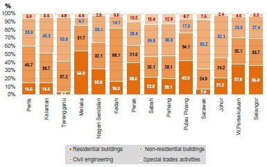 The Residential and Non-residential buildings sub-sector remains significant in the project owned by the private sector which contributed 43.3 per cent and 37.4 per cent respectively to the value of construction work done. Meanwhile, the project owned by the public sector was underpinned by the Civil engineering sub-sector with 70.0 per cent share as shown in Chart 7.