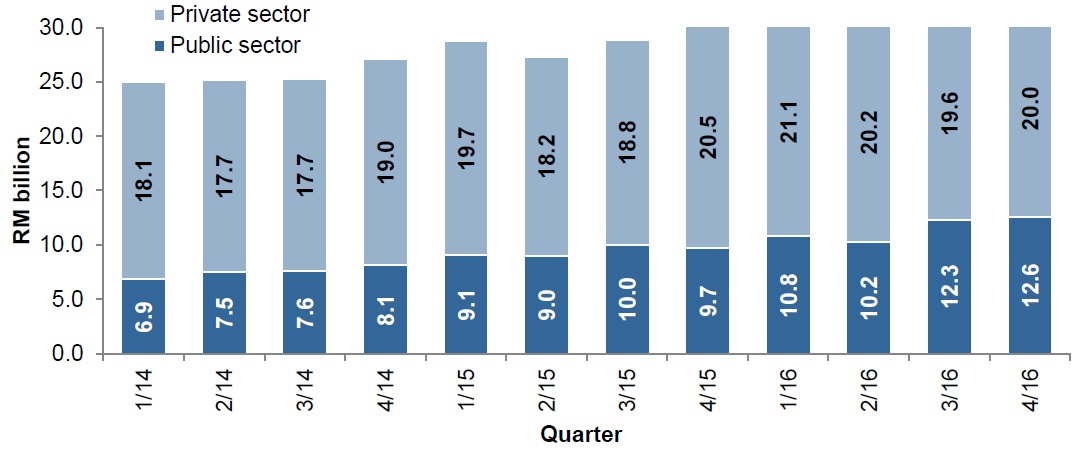 The value of construction work done continued to be dominated by the private sector. The private and the public sectors recorded RM20.0 billion and RM12.6 billion respectively in the fourth quarter of 2016 as shown in Chart 5.
