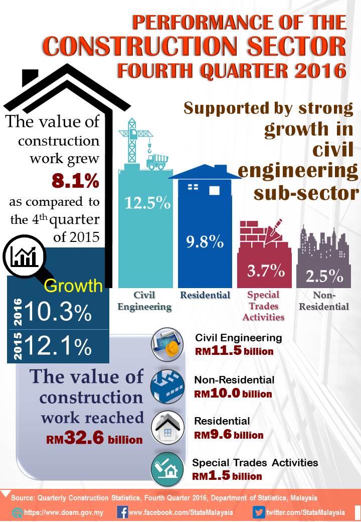 The value of construction work done grew by 8.1 per cent year-on-year basis to record RM32.6 billion in the fourth quarter 2016. Growth was driven mainly by the Civil engineering sub-sector. While, on quarter-on-quarter basis, the value of construction work done increased by 2.0 per cent as compared to the previous quarter. The performance of the construction sector is depicted in Table A.