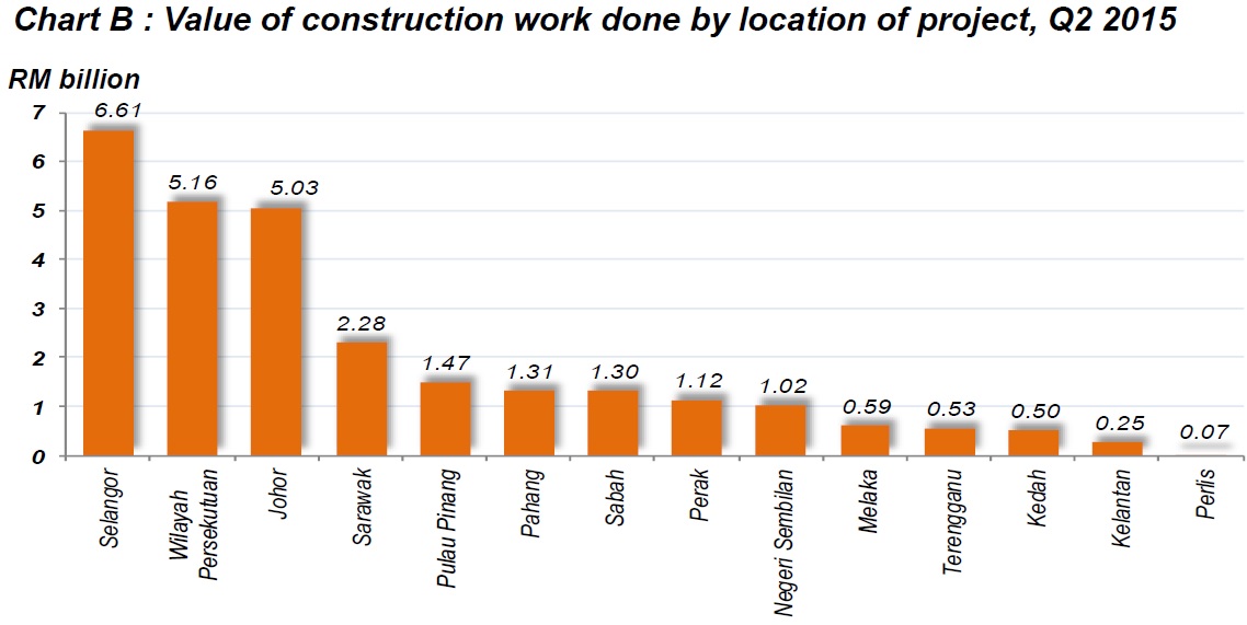 In the current quarter, Selangor continued to record the highest value of construction work done of RM6.61 billion or 24.3 per cent among the states. This was followed by Wilayah Persekutuan, RM5.16 billion (18.9%); Johor, RM5.03 billion (18.5%); Sarawak, RM2.28 billion (8.4%) and Pulau Pinang, RM1.47 billion (5.4%). The contribution of these five states accounted for 75.5 per cent of the total value of construction work done as shown in Chart B.