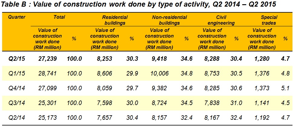In the second quarter of 2015, the highest percentage share was contributed by non-residential buildings sub-sector which recorded 34.6 per cent. This was followed by civil engineering sub-sector (30.4%), residential buildings (30.3%), and special trades (4.7%) as shown in Table B .