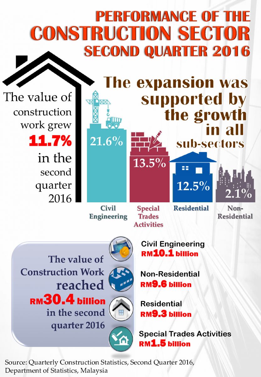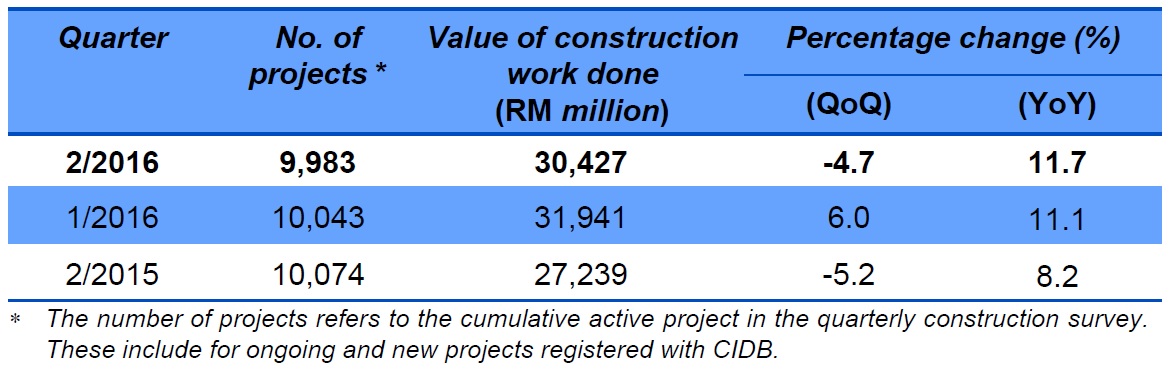 The value of construction work done grew by 11.7 per cent year-on-year basis to record RM30.4 billion in the second quarter 2016. Growth was driven mainly by the civil engineering sub-sector. On a quarter-on-quarter basis, the value of construction work done contracted by 4.7 per cent as compared to the preceding quarter. The decline in growth was due to a slowdown in non-residential buildings sub-sector. The performance of the construction sector is depicted in Table A.