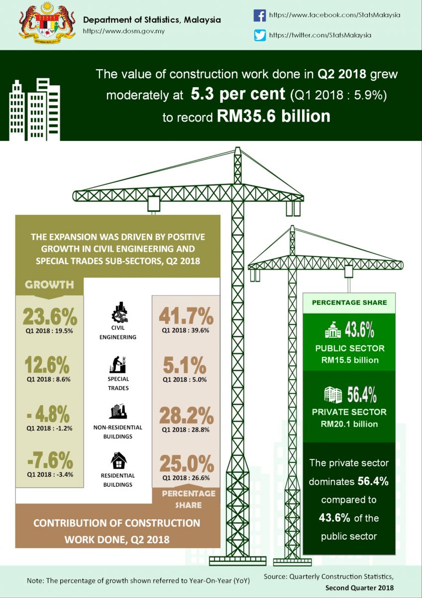The value of construction work done in the second quarter 2018 recorded a moderate growth of 5.3 per cent year-on-year to record RM35.6 billion (Q1 2018: RM37.1 billion).