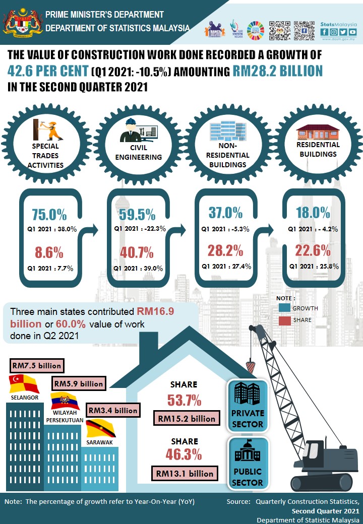 The value of construction work done in the second quarter 2021 grew 42.6 per cent (Q1 2021: -10.5%) year-on-year basis, amounting to RM28.2 billion