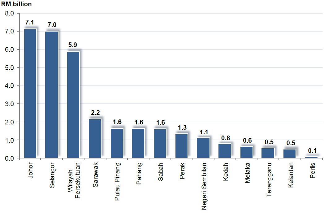 Johor recorded the highest value of construction work done of RM7.1 billion or 22.3 per cent share among the states. This was followed by Selangor, RM7.0 billion (21.9%); Wilayah Persekutuan, RM5.9 billion (18.4%) and Sarawak, RM2.2 billion(6.8%). The contribution of these states accounted for 69.4 per cent of the total value of construction work done as shown in Chart 4.