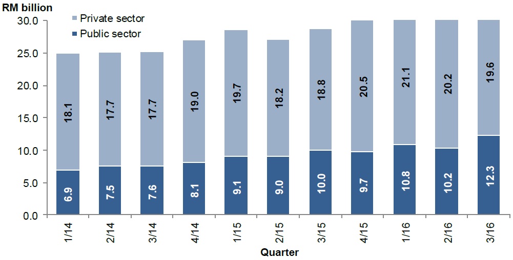 The value of construction work done continued to be dominated by the private sector. The private and the public sectors recorded RM19.6 billion and RM12.3 billion respectively in the third quarter of 2016 as shown in Chart 5.