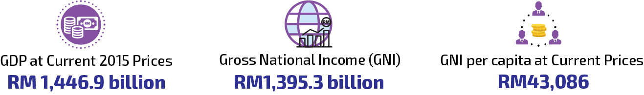 In 2018, Malaysia’s economy reached a new height of RM1.45 trillion at current prices after rebasing exercise. Consequently, Gross National Income (GNI) per capita registered RM43,086 in 2018, approximately USD10,043. Eleventh Malaysia Plan expected GNI per capita to reach RM47,720 by 2020.
