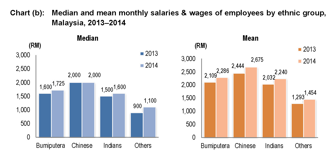 Year on year comparison, the median monthly salaries & wages of Bumiputera employees increased by 7.5 per cent to RM1,725 in 2014. Indians experienced an increase of 6.5 per cent from RM1,500 to RM1,600. The median monthly salaries & wages for Chinese remained at RM2,000 for the same period.