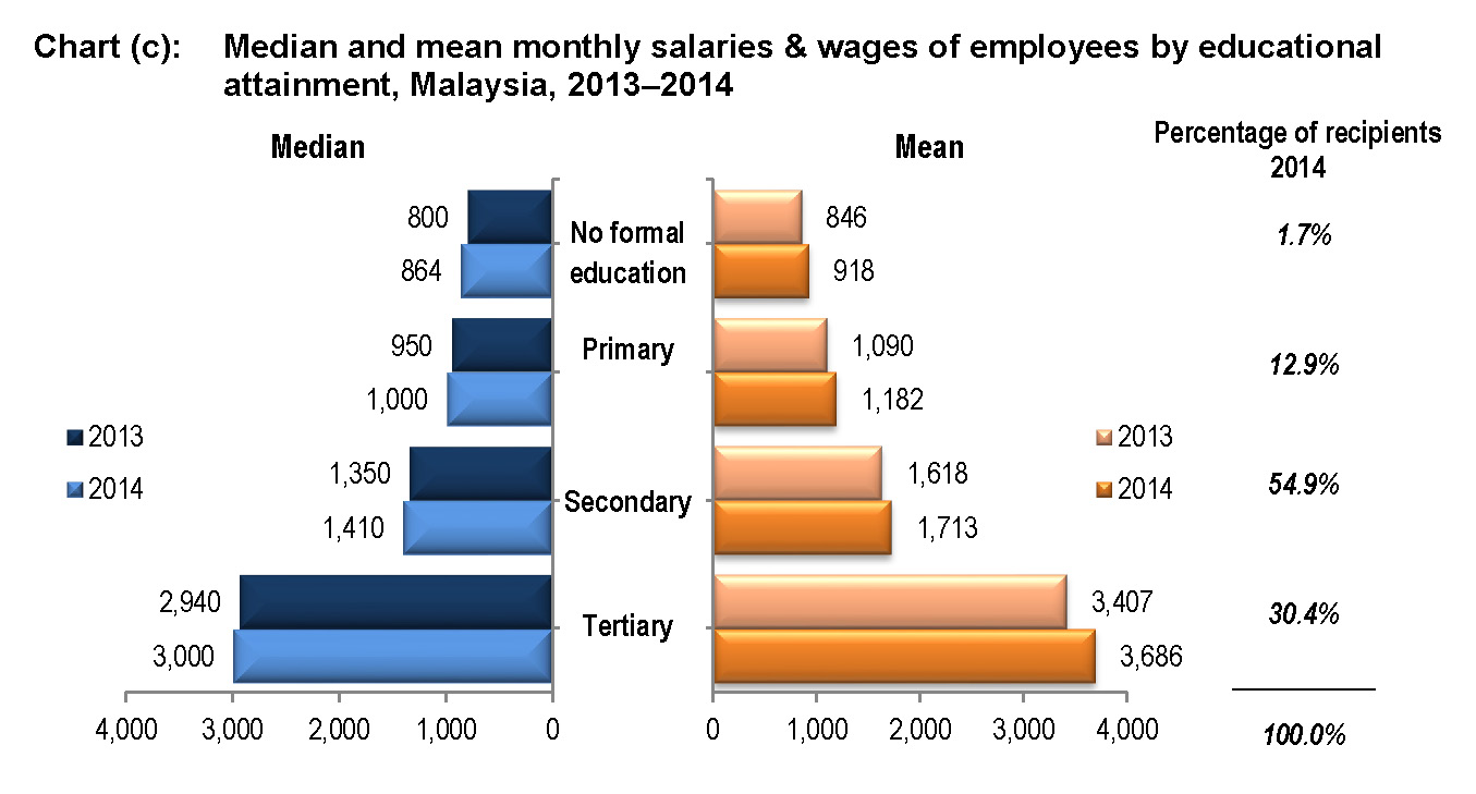 The median monthly salaries & wages received by paid employees increased to RM1,575 in 2014 compared with RM1,500 in 2013, recording the annual growth rate of 4.9 per cent. Meanwhile, the mean monthly salaries & wages increased by 8.4 per cent during the same period that is from RM2,052 to RM2,231.