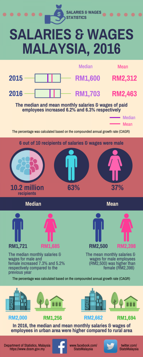 Monthly salaries & wages of employees by sex In 2016, the median monthly salaries & wages of male employees was higher at RM1,721 compared to female employees, RM1,685. The median for male employees increased 7.3 per cent while for female increased 5.2 per cent compared to the previous year. Similarly, in terms of the mean, male employees received monthly salaries & wages (RM2,500) higher than female (RM2,398) [Table 2]. |