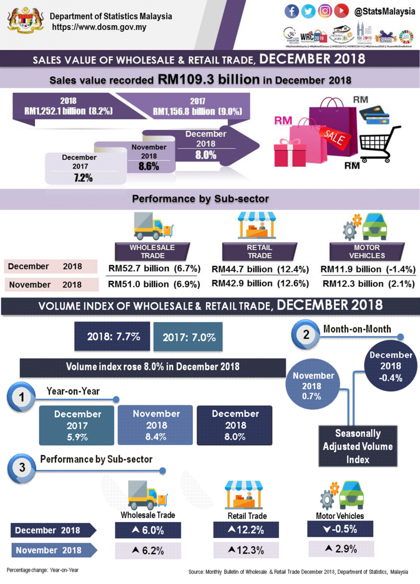 Sales of Wholesale & Retail Trade increased 8.0 per cent in December 2018 compared to December 2017. The increase was attributed by Retail Trade sub-sector which continued its double-digit growth at 12.4 per cent. For 2018 performance, the sales value recorded a growth of 8.2 per cent to RM1,252.1 billion compared to 2017.