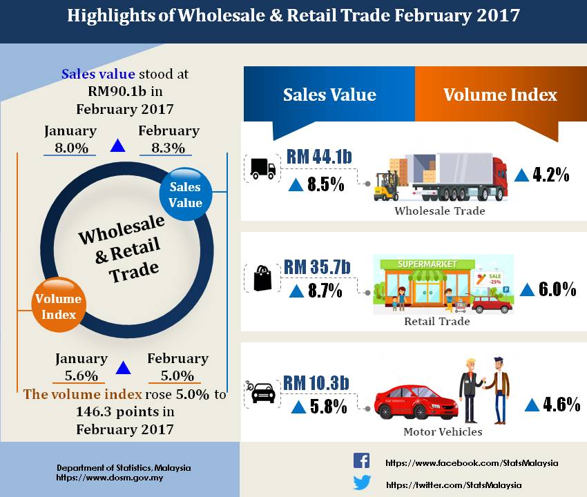 Sales value of Wholesale & Retail Trade stood at RM90.1 billion in February 2017, registering 8.3 per cent growth as compared to the corresponding period in 2016. The sales value consists of Wholesale Trade ( RM44.1 billion), Retail Trade (RM35.7 billion) and Motor Vehicles (RM10.3 billion) businesses. The positive growth was contributed by both Retail Trade (8.7%) and Wholesale Trade (8.5%) businesses.