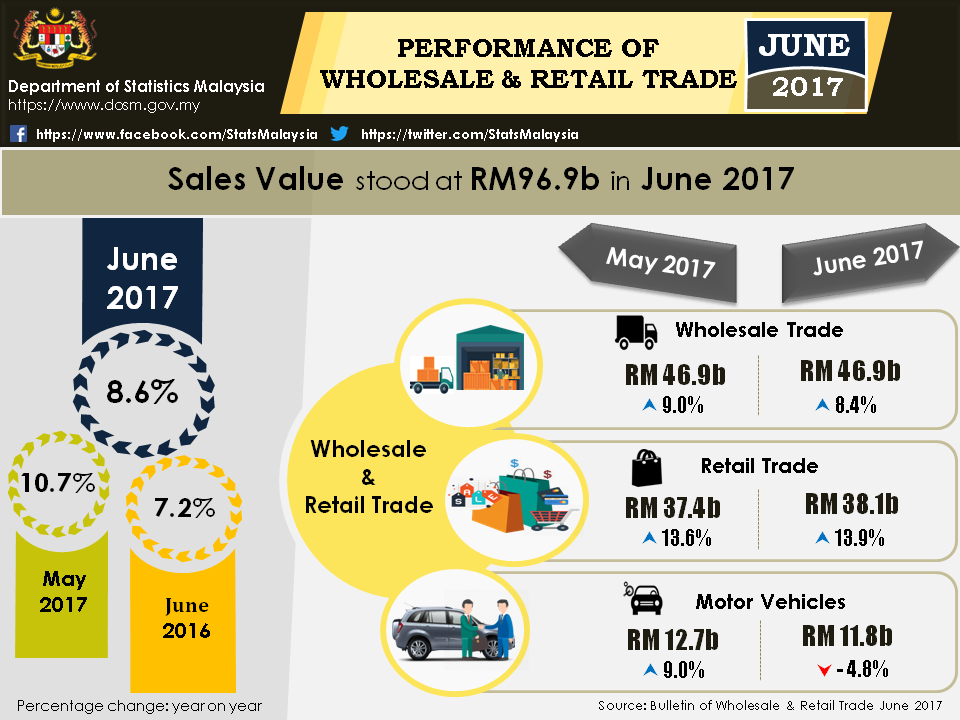 Sales value of Wholesale & Retail Trade stood at RM96.9 billion in June 2017, registering 8.6 per cent growth as compared to the corresponding period in 2016. The sales value consists of Wholesale Trade (RM46.9 billion), Retail Trade (RM38.1 billion) and Motor Vehicles (RM11.8 billion) businesses. The positive growth was contributed by Retail Trade (13.9%).