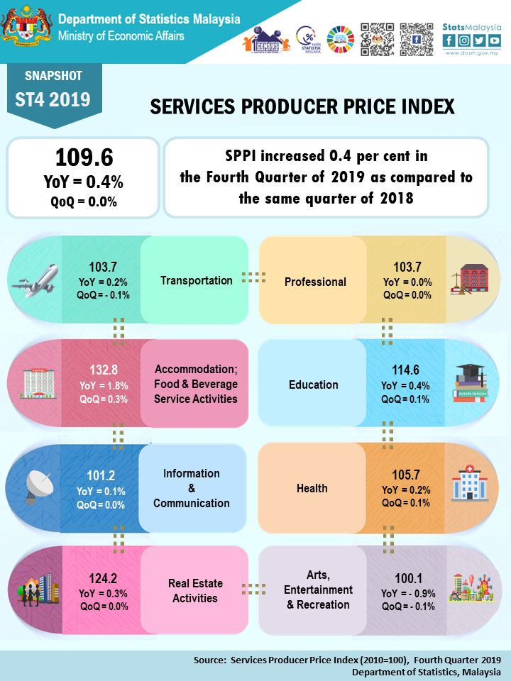 The Services Producer Price Index (SPPI) for the fourth quarter of 2019 increased 0.4 per cent to 109.6 as compared to 109.2 in the same quarter of the preceding year. The main sub-sectors that contributed to the increase were Accommodation; Food & Beverage Service Activities (1.8%), Education (0.4%), Real Estate Activities (0.3%), Transportation (0.2%), Health (0.2%) and Information & Communication (0.1%) indices. The index for Arts, Entertainment & Recreation decreased 0.9 per cent while the Professional sub-sector was unchanged.