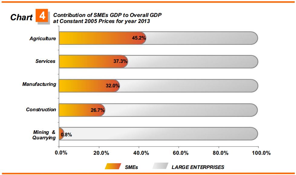 In 2013, value added of SMEs for Construction sector contributed 26.7 per cent whereby Special trade and Civil engineering were the catalyst of this sector. Nevertheless, value added of SMEs in Mining & Quarrying sector such as quarrying of granite and limestone contributed a marginal share of 0.8 per cent.