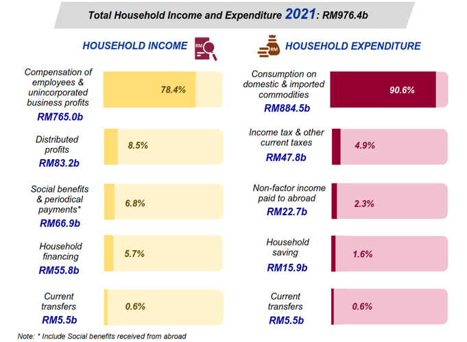 The total household income in 2021 was RM976.4 billion with the main contributor was compensation of employees & unincorporated business profits, amounting to RM765.0 billion (78.4%), followed by distributed profits at RM83.2 billion (8.5%) and social benefits & periodical payments at RM66.9 billion (6.8%). Additionally, household financing recorded a total of RM55.8 billion (5.7%) while current transfers amounted to RM5.5 billion (0.6%).