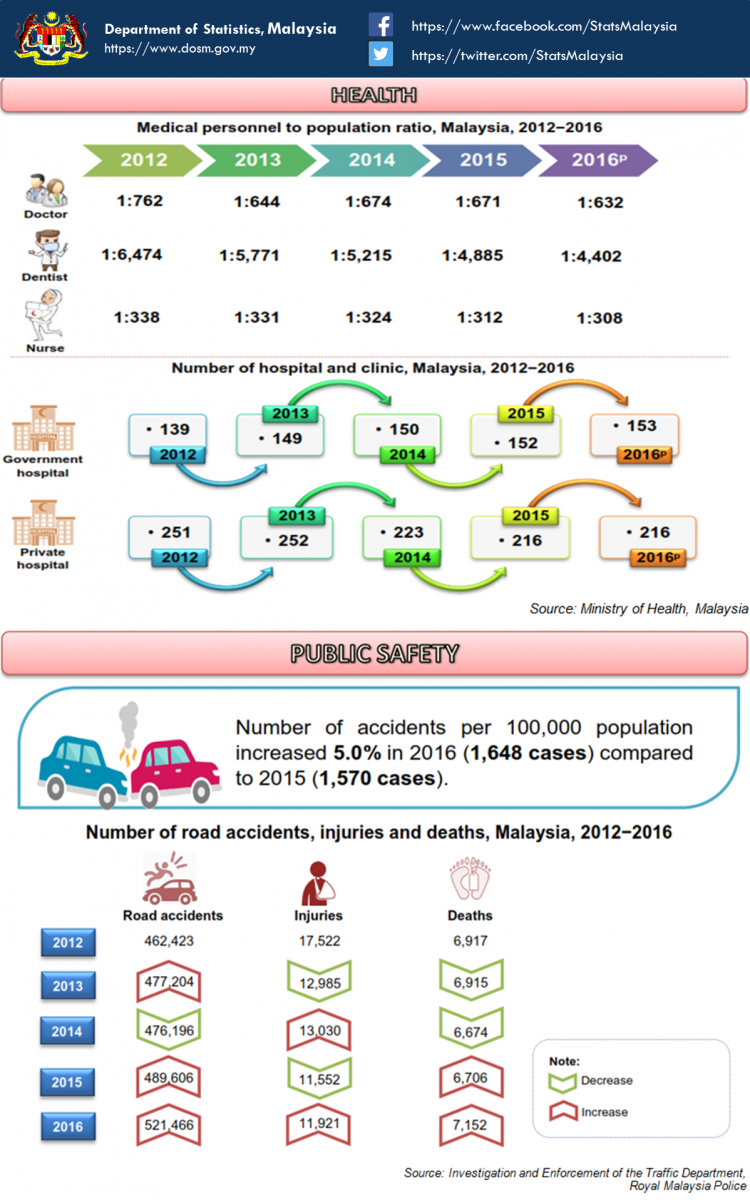 Social Statistics Bulletin, Malaysia, 2017 presents selected statistics on population, housing, health, education, employment, welfare services, public safety and communication & recreation. These fields were identified as the basic measurement of the quality of life and social well-being. Selected social statistics on health, social welfare, public safety and communication & recreation are highlighted as follows: