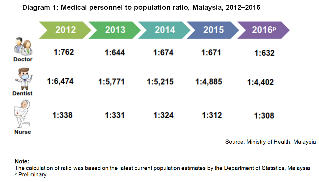 The number of doctors increased from 46,491 (2015) to 50,087 persons in 2016. This showed an increase of 7.7 per cent as compared to 2015. The ratio of doctor to population for 2016 was 632 persons as compared to 671 persons in 2015.