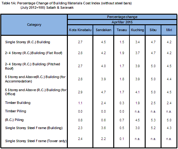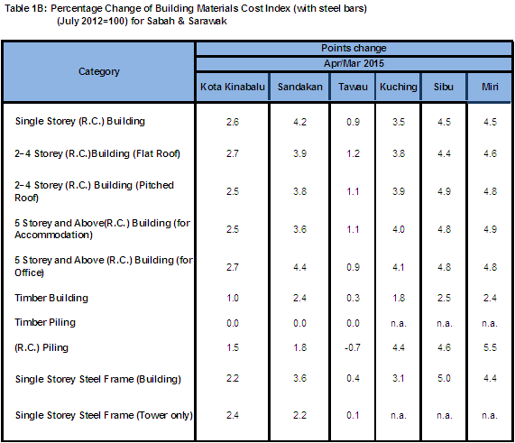 The Building Material Cost Index (BCI) (without steel bars and with steel bars) for all building categories of Peninsular Malaysia showed increases in April 2015 as compared to the previous month.