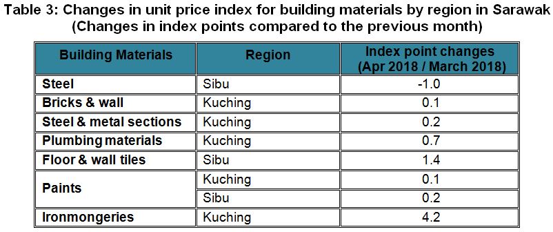 The Building Material Cost Index (BCI) (without steel bars and with steel bars) in Kuching and Sibu recorded increases for almost all building categories in April 2018. Meanwhile, the BCI in Miri remained unchanged as compared to the previous month.