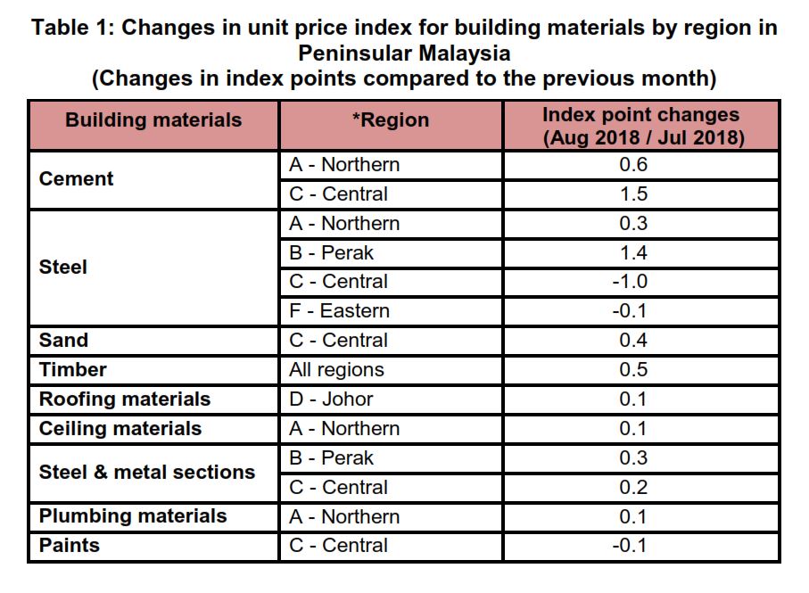 The BCI (with steel bars) in all regions showed increases for almost all categories of building except for several categories of building in region C-Central (Wilayah Persekutuan Kuala Lumpur, Melaka, Negeri Sembilan and Selangor) and E-Pahang which showed a decrease 0.1 per cent as compared to the previous month.