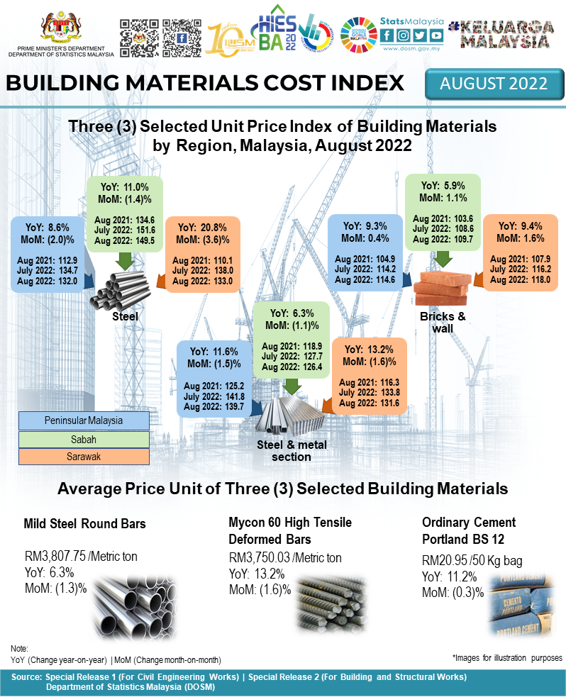 The building materials cost index (BCI) (without steel bars & with steel bars) for all building categories in Peninsular Malaysia, Sabah and Sarawak increased between 0.2 to 22.0 per cent in August 2022 as compared to a year ago. For the same period, the increase in BCI for Peninsular Malaysia was between 5.5 and 18.0 per cent, Sabah between 0.2 and 15.3 per cent and Sarawak between 5.4 and 22.0 per cent.