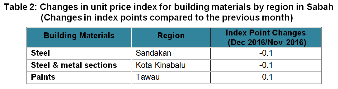 The BCI (with steel bars) in Kota Kinabalu recorded a decrease of 0.1 per cent for single storey steel frame (tower only) building category. Similarly, the BCI in Sandakan for single storey (R.C.) building, 5 storey and above (R.C.) building (for accommodation), 5 storey and above (R.C.) building (for office) and (R.C.) piling building categories recorded decreases of 0.1 per cent in December 2016 as compared to the previous month.