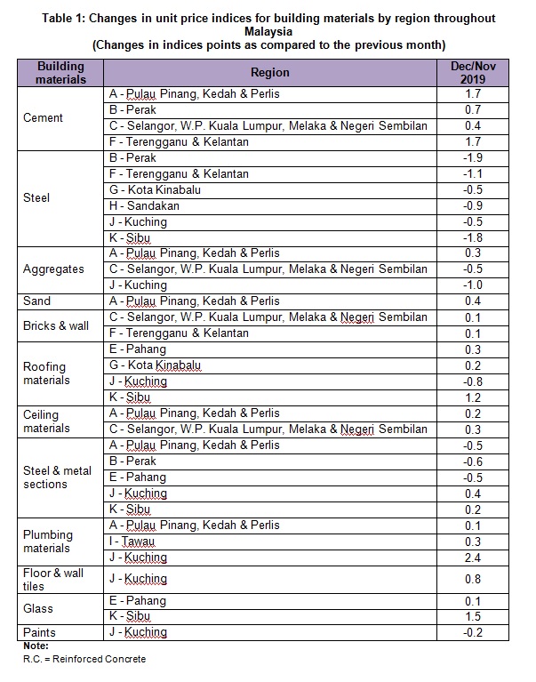 The changes in unit price indices of building materials by region throughout Malaysia are shown in Table 1.