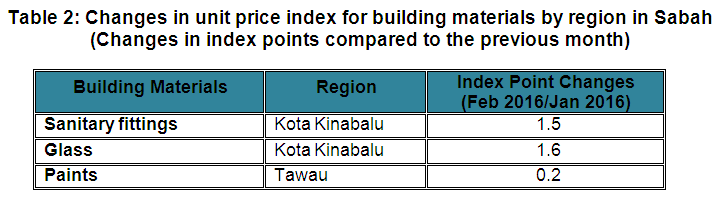 Changes in unit price index for building materials by region in Sabah are as follows: