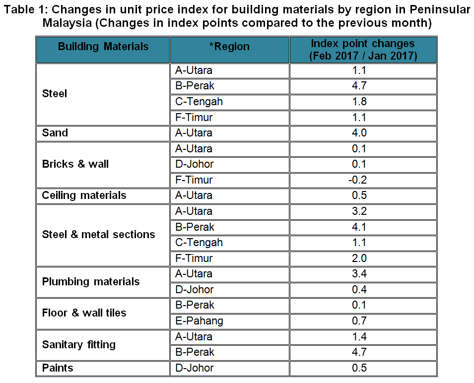 The Building Material Cost Index (BCI) (without steel bars) in Kota Kinabalu recorded increases for single storey steel frame (building) and single storey steel frame (tower only) in February 2017. While, the BCI in Sandakan and Tawau remained unchanged as compared to the previous month.