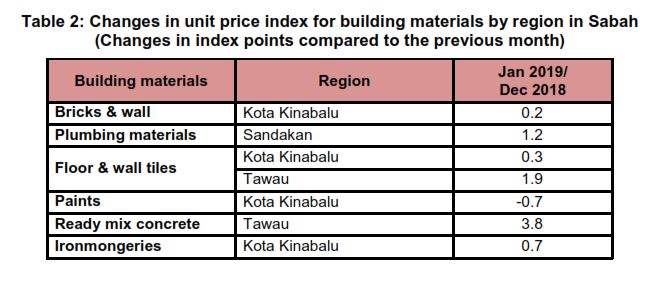 The Building Material Cost Index (BCI) (without steel bars) for all categories of building in Sandakan increased between 0.2 and 3.0 per cent in January 2019 except Timber piling and Single storey steel frame (tower only). Likewise, the BCI in Tawau showed an increase of 0.1 per cent for Single storey (R.C.) building, 2-4 storey (R.C) building (flat roof), 2-4 storey (R.C.) building (pitched roof), 5 storey and above (R.C.) building (for accommodation) and 5 storey and above (R.C.) building (for office). While, the BCI in Kota Kinabalu remained unchange as compared to the previous month.