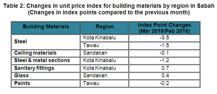 The Building Material Cost Index (BCI) (without steel bars) in Sabah has remained unchanged except in Kota Kinabalu for single storey (R.C.) building (-0.1%), 2-4 storey (R.C.) building (flat roof) (0.1%), single storey steel frame (building) (-0.6%) and single storey steel frame (tower only) (-1.0%) in March 2016 as compared to the previous month.