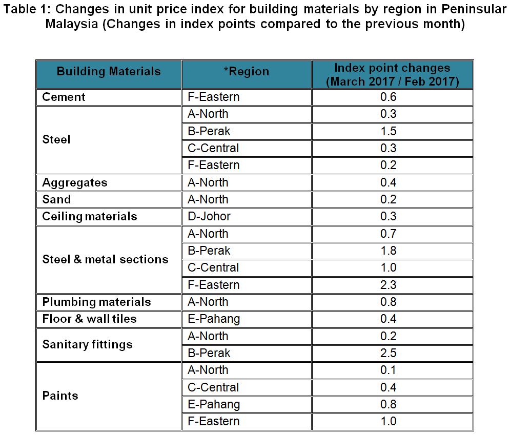 The Building Material Cost Index (BCI) (without steel bars and with steel bars) for almost all categories of building in all regions showed increases in March 2017 except for region D-Johor which remained unchanged as compared to the previous month.