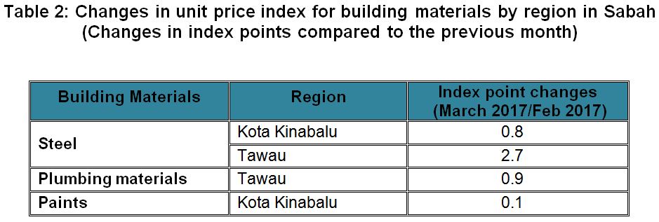 The BCI (with steel bars) for almost all categories of building in Kota Kinabalu and Tawau showed increases in March 2017. While, the BCI in Sandakan remained unchanged as compared to the previous month.
