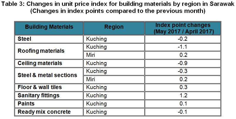 The Building Material Cost Index (BCI) (without steel bars and with steel bars) in Miri increased for several categories of buildings in May 2017. In contrast, the BCI in Kuching showed decreases for almost all categories of buildings except 2-4 storey (R.C.) building (flat roof) which remained unchange. Meanwhile, the BCI in Sibu showed no change as compared to the previous month.