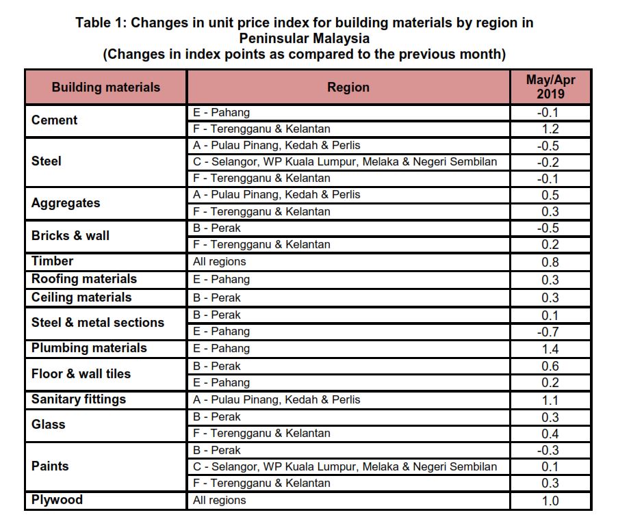 The Building Material Cost Index (BCI) (without steel bars and with steel bars) for almost all categories of building in all regions increased between 0.1 and 0.8 per cent in May 2019 as compared to the previous month. However, the BCI (with steel bars) in region A (Pulau Pinang, Kedah & Perlis) for 2-4 storey (R.C.) building (flat roof), 5 storey and above (R.C.) building (for accommodation) and 5 storey and above (R.C.) building (for office) decreased 0.1 per cent respectively as compared to the previous month.