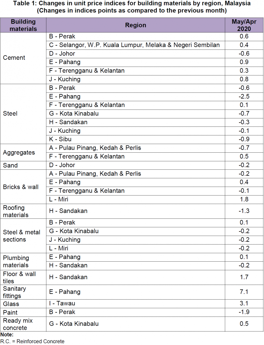 The changes in unit price indices of building materials by region in Malaysia are shown in Table 1.