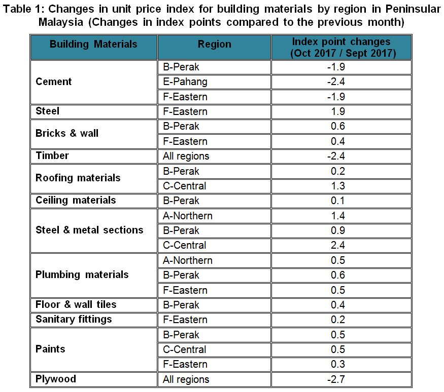 The unit price indices of building materials that showed changes in October 2017 as compared to the previous month are as follows: