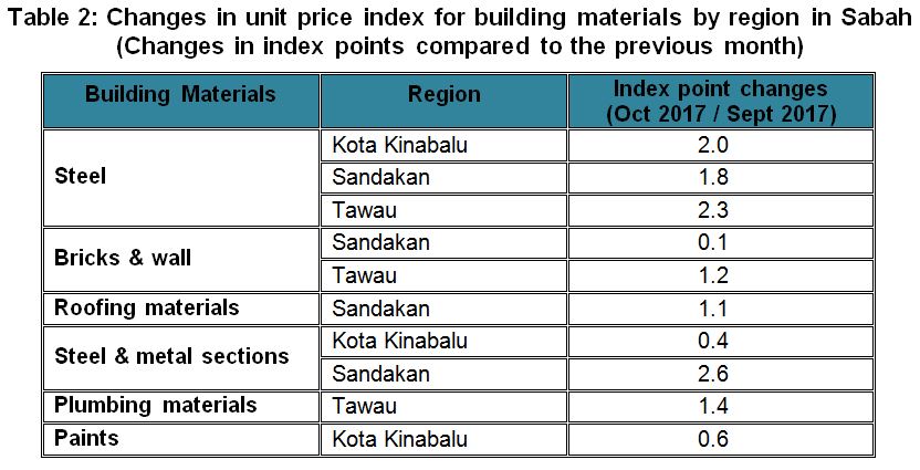The changes in the unit price indices for building materials by region in Sabah are shown in Table 2.