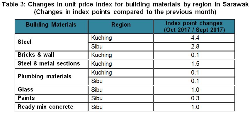 The Building Material Cost Index (BCI) (without steel bars and with steel bars) in Kuching and Sibu showed increases for all categories of building in October 2017. In contrast, the BCI in Miri did not show any changes as compared to the previous month.