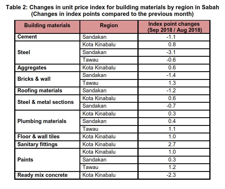 The Building Material Cost Index (BCI) (without steel bars) in Kota Kinabalu for timber building, (R.C.) piling, single storey steel frame (building) and single storey steel frame (tower only) showed changes of 0.1 per cent, -1.7 per cent, 0.3 per cent and 0.4 per cent respectively in September as compared to August 2018. The BCI in Sandakan decreased for almost all categories of building except for timber piling which was unchange as compared to the previous month. While, the BCI in Tawau for several categories of building increased as compared to the previous month.